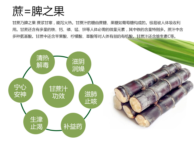 蔗產地在我國分布較廣,甘蔗多汁、含有糖、蛋白質、脂肪、鈣、磷、鐵及維生素B1、B2、B6和C等主要營養物質。甘蔗汁涼快、味道好,是幼兒、中老年人喜歡的飲料。