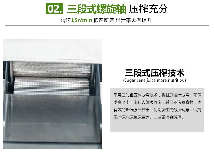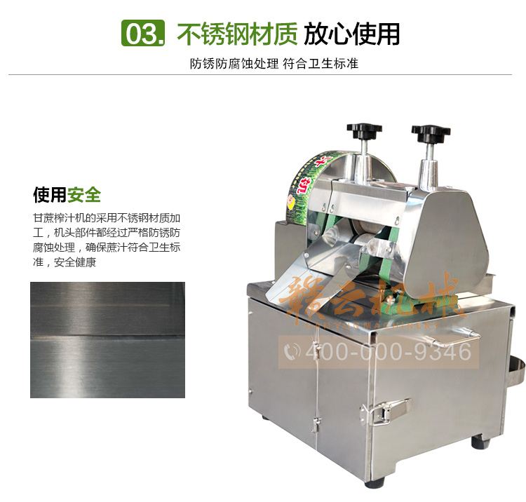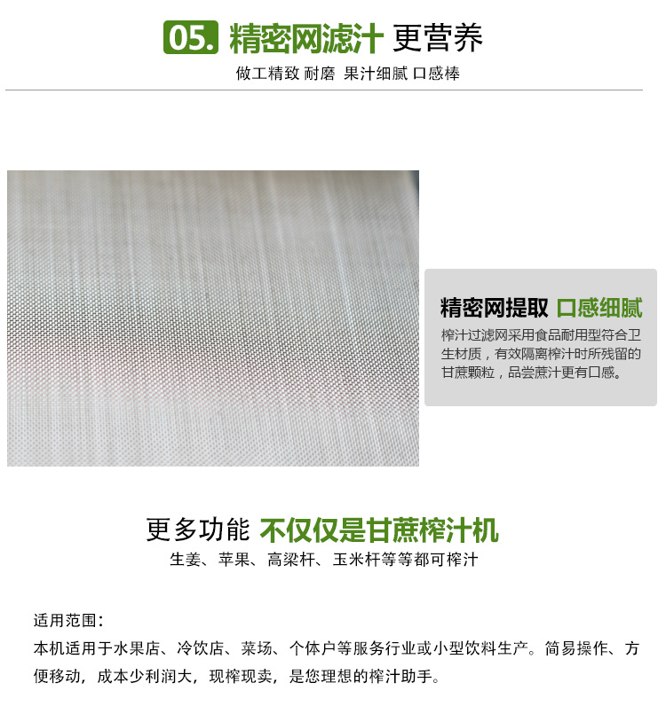 本產品適用于城鄉商場、菜場、商業街等人流量集中區。男女老少均可操作,成本低、利潤高,現榨現賣,是發家致富的好幫手。可加工甘蔗、生姜、蘋果、高粱桿、玉米桿等進行榨汁之用。