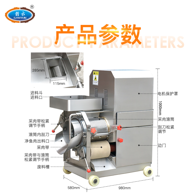 贛云牌魚肉分離機又稱之為魚肉采肉機、魚糜采取機、蝦殼分離機、去魚骨機、泥鰍采肉機、去魚刺機,通過擠壓原理將魚肉和魚骨等分離開來,魚肉采肉前需漿活魚去頭部和內臟。贛云牌魚肉分離機有普通材質和不銹鋼材質,普通材質魚肉分離機有兩種型號,分別是GY-CR-160型和GY-CR-200型,不銹鋼材質魚肉分離機有兩種型號,分別是GY-CR-200型和GY-CR-300型。
