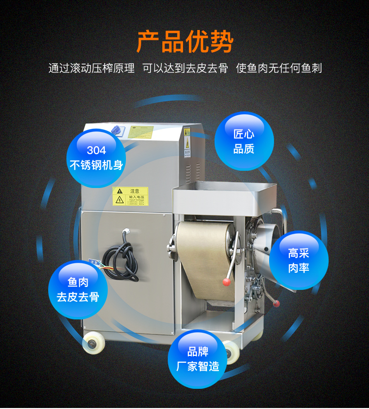 贛云系列不銹鋼300型魚肉采肉機又稱為去魚骨機,采用擠壓原理將魚肉跟魚皮和魚骨分離開來,達到采魚肉的作用,這樣分離出來的魚肉含魚骨較少,還含有少量的魚筋、魚血等雜物,一般可使用魚糜精濾機過濾一遍,可使魚肉色純,魚肉更細膩,生產高品質魚糜制品。