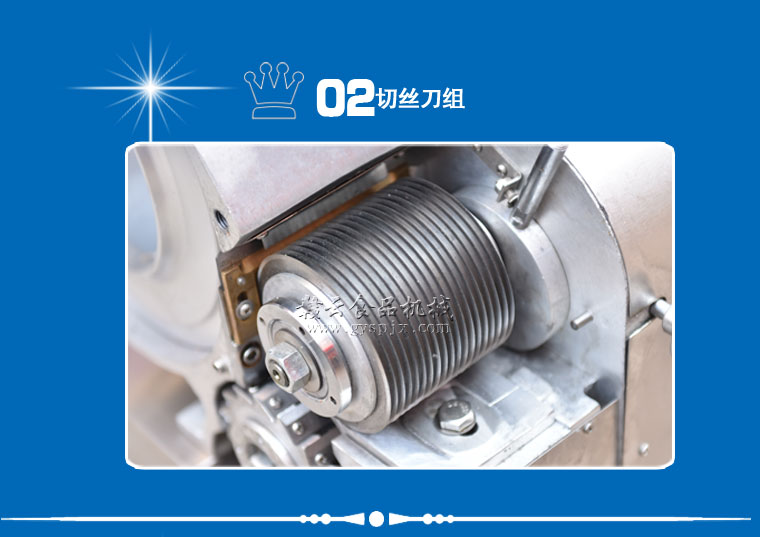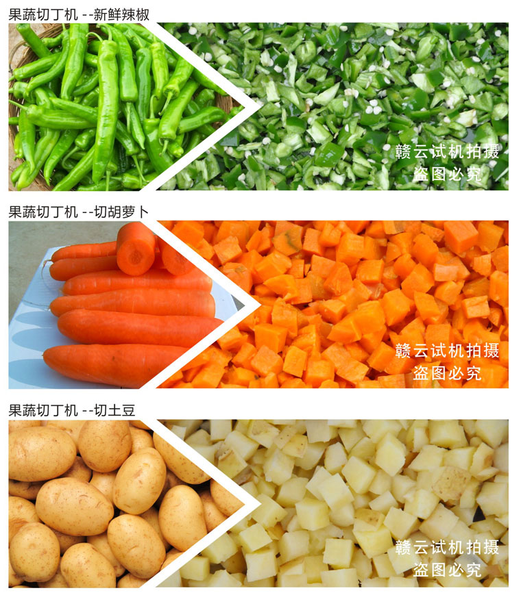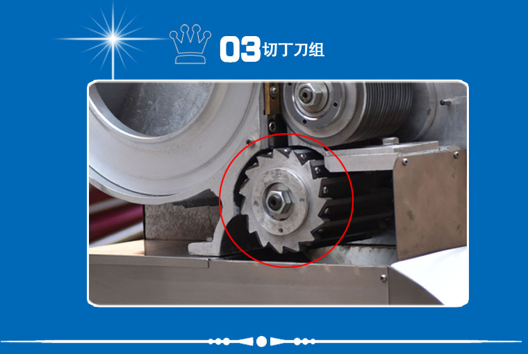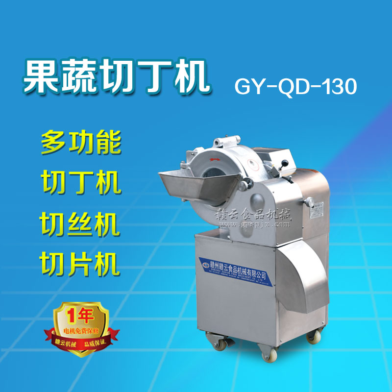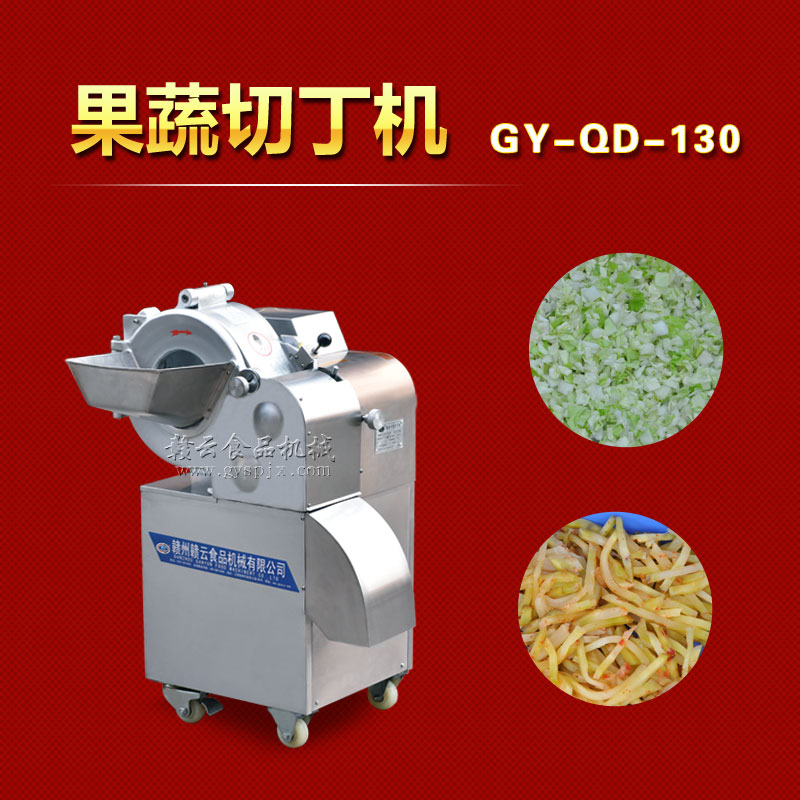 工作原理:GY-DQ-130型切丁機通過旋轉撥盤將被切物體帶動高速旋轉,利用物體的離心力,立刀將物體切成片狀,然后經過圓盤切絲刀片豎切成條狀,并將條狀物送入橫切斷刀口,由橫切斷刀盤切刀切成所需的長方體或立方體。