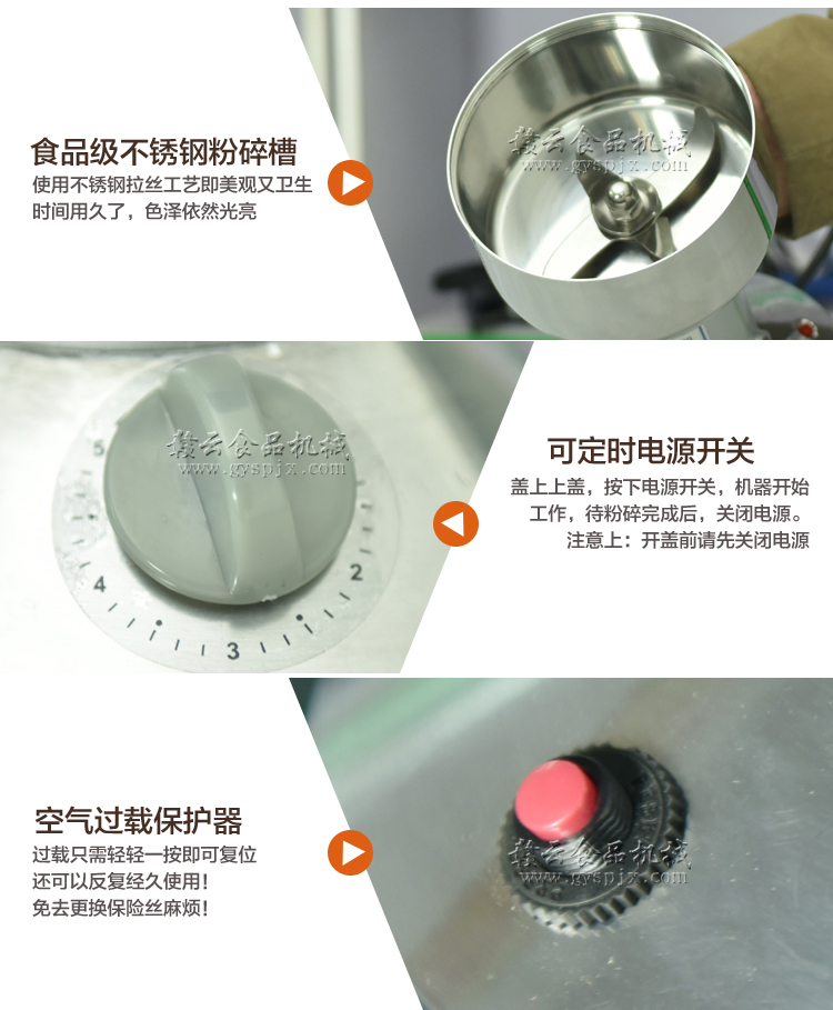 贛云系列多功能粉碎機采用純銅高速電機帶動粉碎刀片將物料快速打成粉末,可用于粉碎五谷、雜糧、田七、阿膠、白叁等,一般粉碎時間1-2分鐘即可,新款粉碎機改保險絲為空氣過載保護器,使用更安全,我廠提供的粉碎機有100克-1000克不同型號的多功能粉碎機。