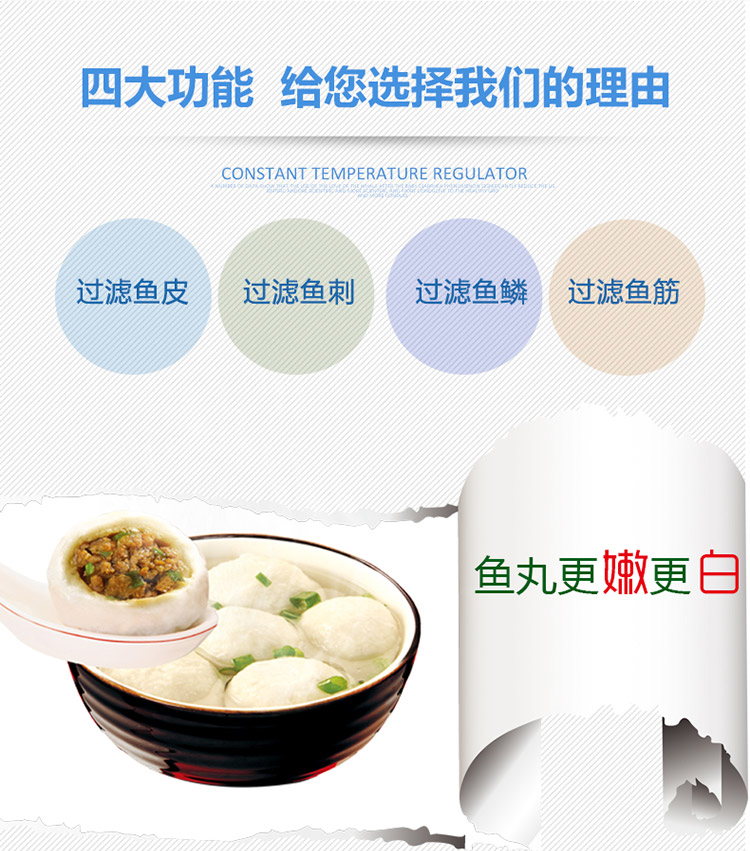 選用材料符合國際食品衛生要求,做工細致、外表美觀、便于清洗,用于打魚漿、肉漿,適合食品加工廠之用。(也適合芋頭和紅薯濾筋。)