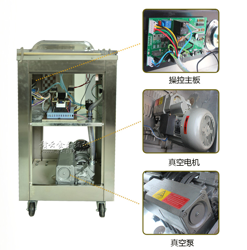 3、壓下真空蓋,面板上的抽氣指示燈亮,真空泵開始抽氣,機蓋即被自動吸引,抽真空時間可根據包裝要求調節適當時間。