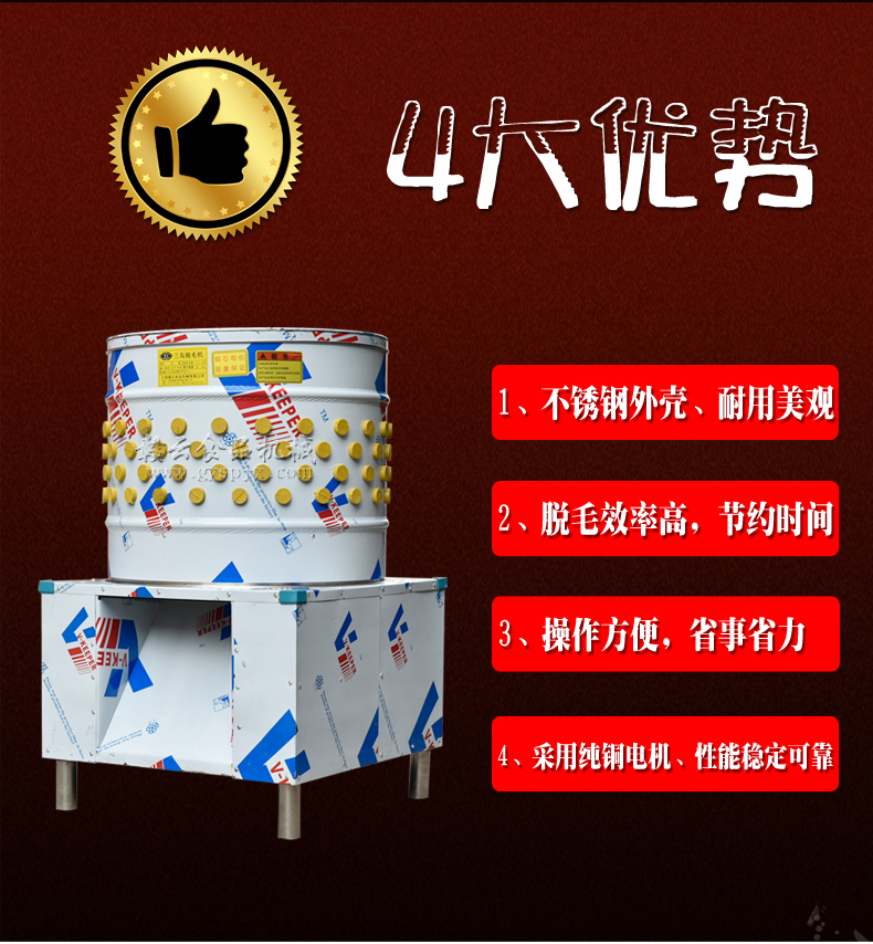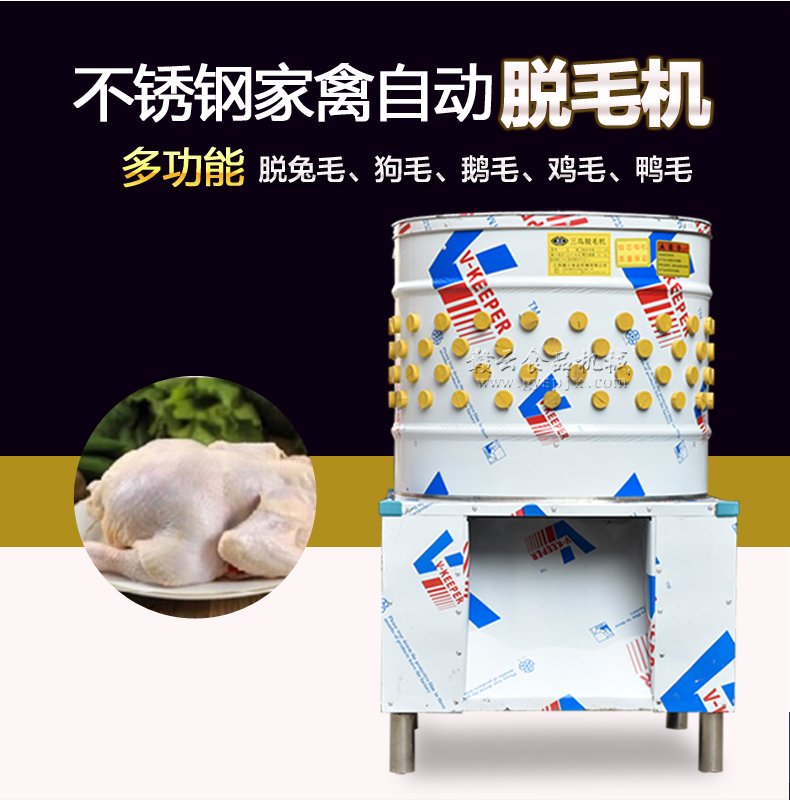 家禽脫毛機有大號、小號與中號之分,采用全不銹鋼材質,加工雞、鴨、兔、鳥等禽類脫毛之用.