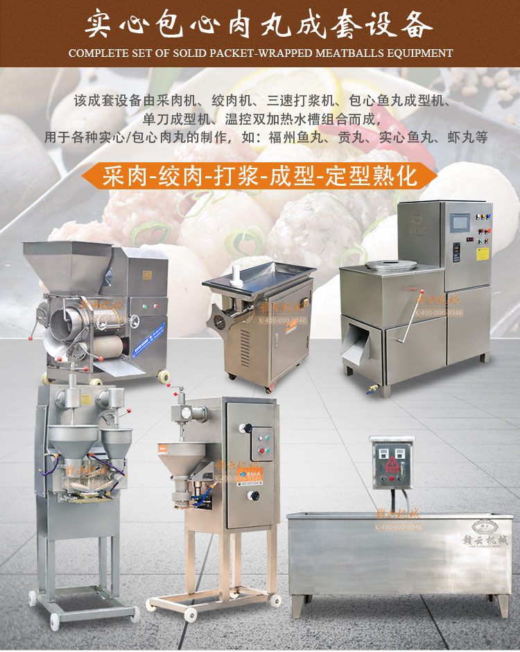 實心肉丸成套設備,包心肉丸成套設備一體組合,能生產新鮮各式實心肉丸,包心肉丸,如實心豬肉丸、魚丸,潮汕牛肉丸,蝦丸蟹丸等各種實心丸子,及福州魚丸、包心豬肉丸,包心牛肉丸等各式包心肉丸等,本套設備有絞肉機、采肉機、制冷三速打漿機、單刀高速多功能成型機、包心肉丸成型機和熟化水槽。