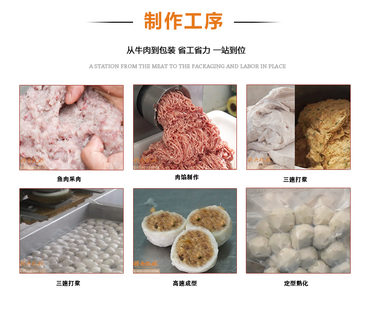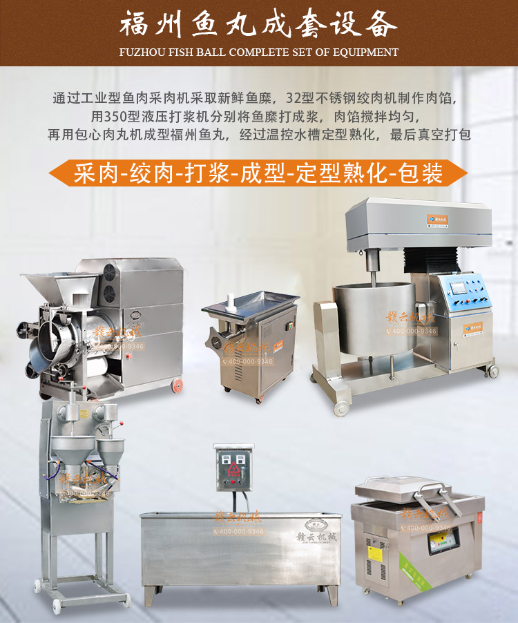 福州魚丸成套設備,時產500kg配套組合,采用新鮮淡水魚或海魚為原料加工,通過350工業型魚肉采肉機采取新鮮魚糜,用350型液壓打漿機調制成漿,32型不銹鋼絞肉機制作肉餡,用第三代包心肉丸機成型福州魚丸,后經過熟化定型水槽定型熟化
