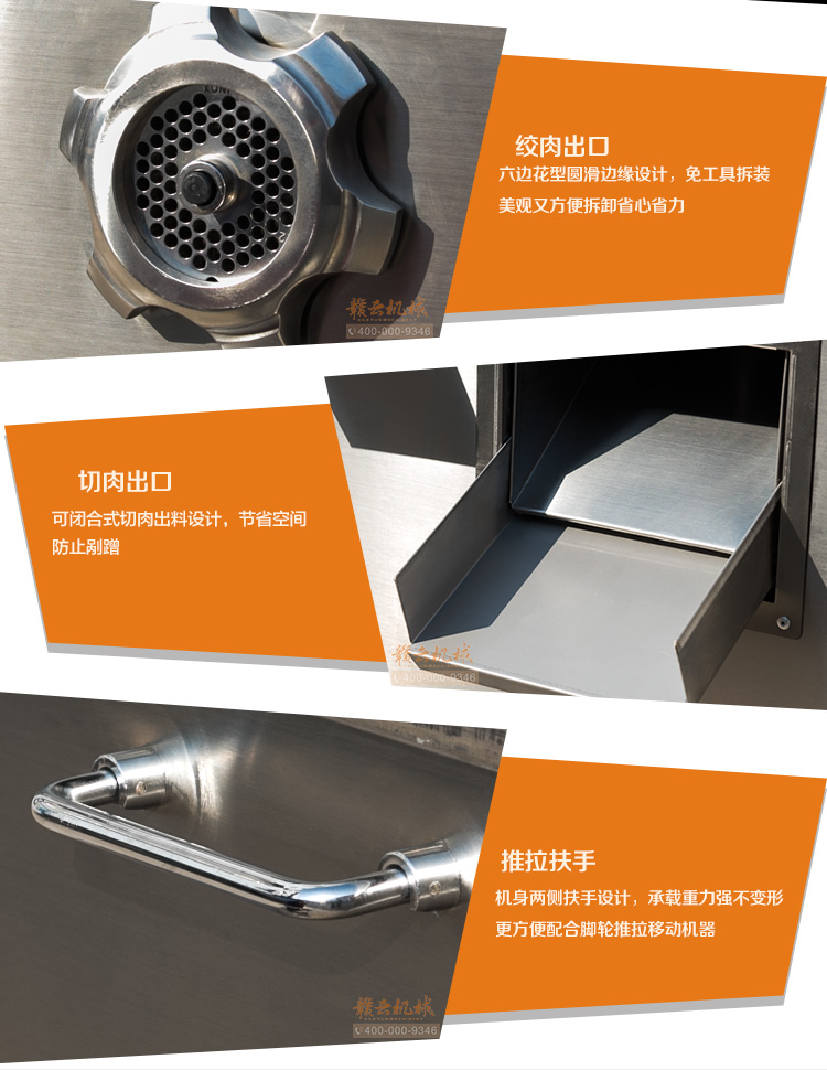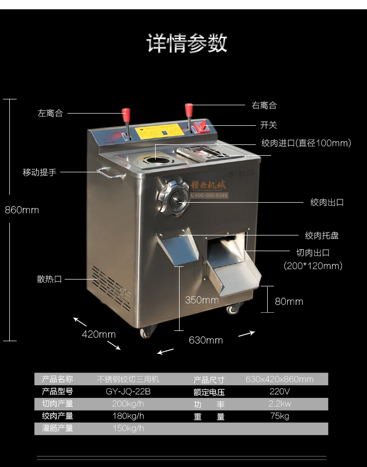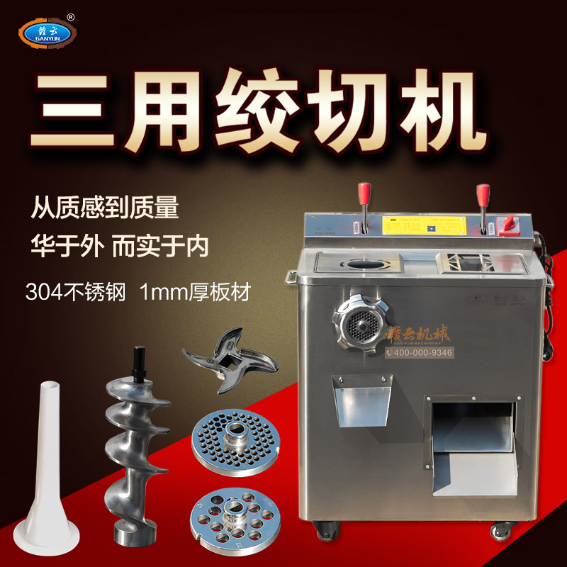 贛云2017款絞切三用機火熱開賣,新品上市,全304不銹鋼板材封裝設計,外形美觀大氣,配有3.5mm和5mm切肉片雙入口,可切兩種規格肉片,整機配備2.2kw大功率純銅電機作為動力,絞肉切肉力度強而有力,速度快,離合開關控制,操作隨心。