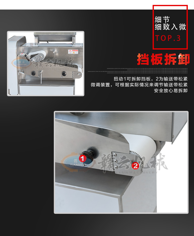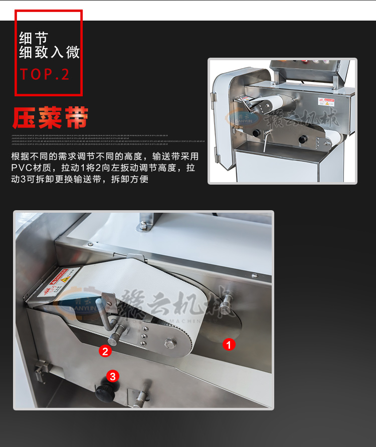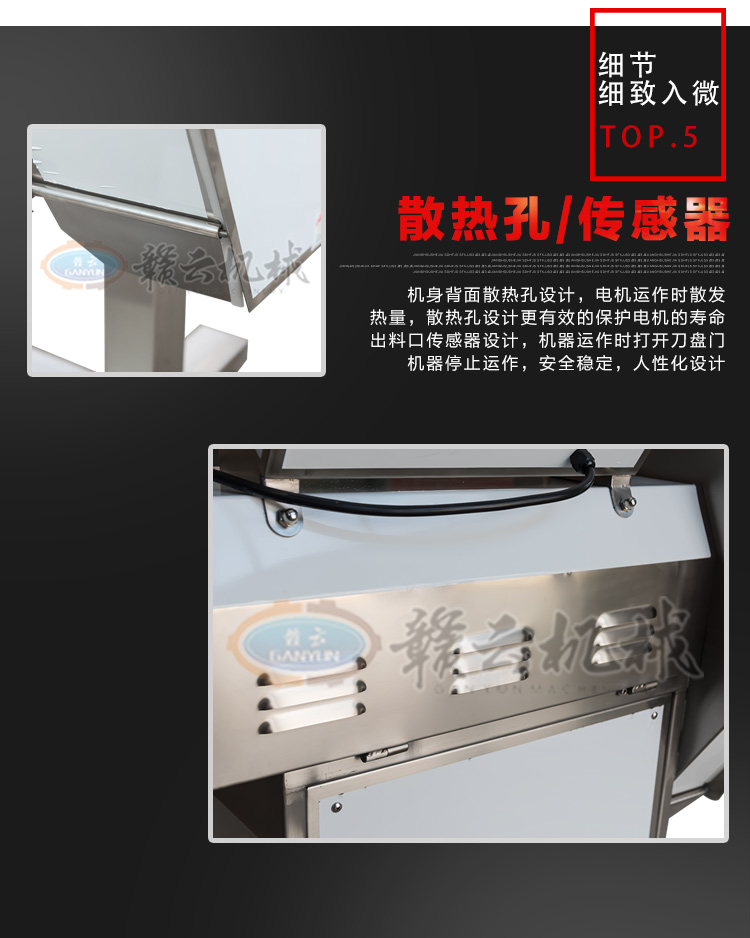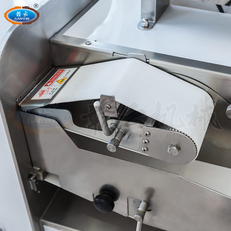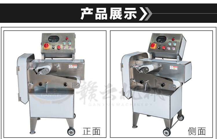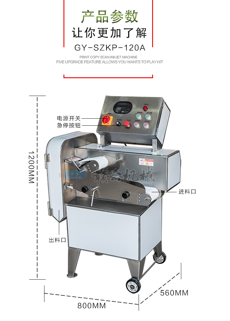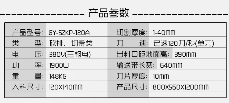 GY-SZKP-120A砍排機,優質刀片。通過調節輸送帶速度控制切骨長短線路排列整齊,防水設計開關按鈕,有機玻璃可清楚的看到變頻器參數。壓菜帶根據不同的需求調節不同的高度,輸送帶采用PVC材質,可拆卸更換輸送帶,拆卸方便。優質刀片,杜絕卷刃。機身背面散熱孔設計,電機運作時散發熱量,散熱孔設計更有效的保護電機的壽命,出料口傳感器設計,機器運作時打開刀盤門機器停止運作,安全穩定,人性化設計。