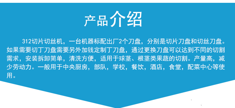 312型多功能切菜機,切菜用什么好,什么牌子的切菜機好 312切片切絲機,一臺機器標配出廠2個刀盤,分別是切片刀盤和切絲刀盤。如果需要切丁刀盤需要另外加錢定制丁刀盤,通過更換刀盤可以達到不同的切割需求,安裝拆卸簡單,清洗方便,適用于球莖、根莖類果蔬的切割。產量高,減少勞動力。一般用于中央廚房,部隊,學校,餐飲,酒店,食堂,配菜中心等使用。