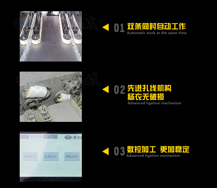 該香腸扎線機機械的優點是節約腸衣,并且線扎的產品不用人工和機械剪節,相對扭結可節約人工3人以上和對剪節設備的投入;相對半自動扎線機可節約10人的費用,切免除工人的體力勞動之苦。該扎線機操控十分簡單,由于采用人機對話的液晶屏,設定長度和速度后,便可以讓機械自動高效完成所有工作。
