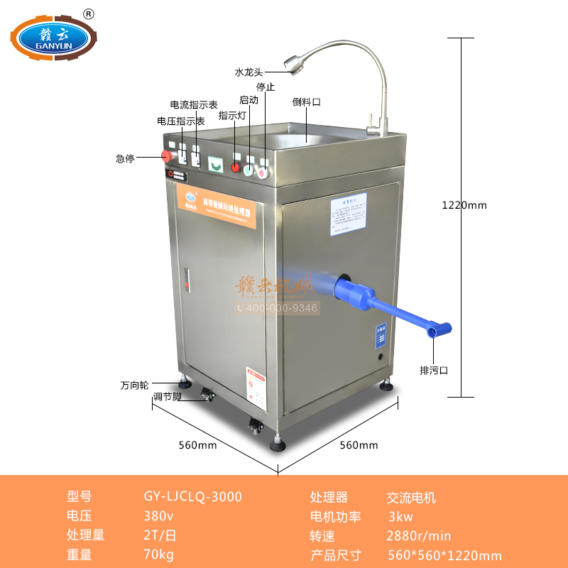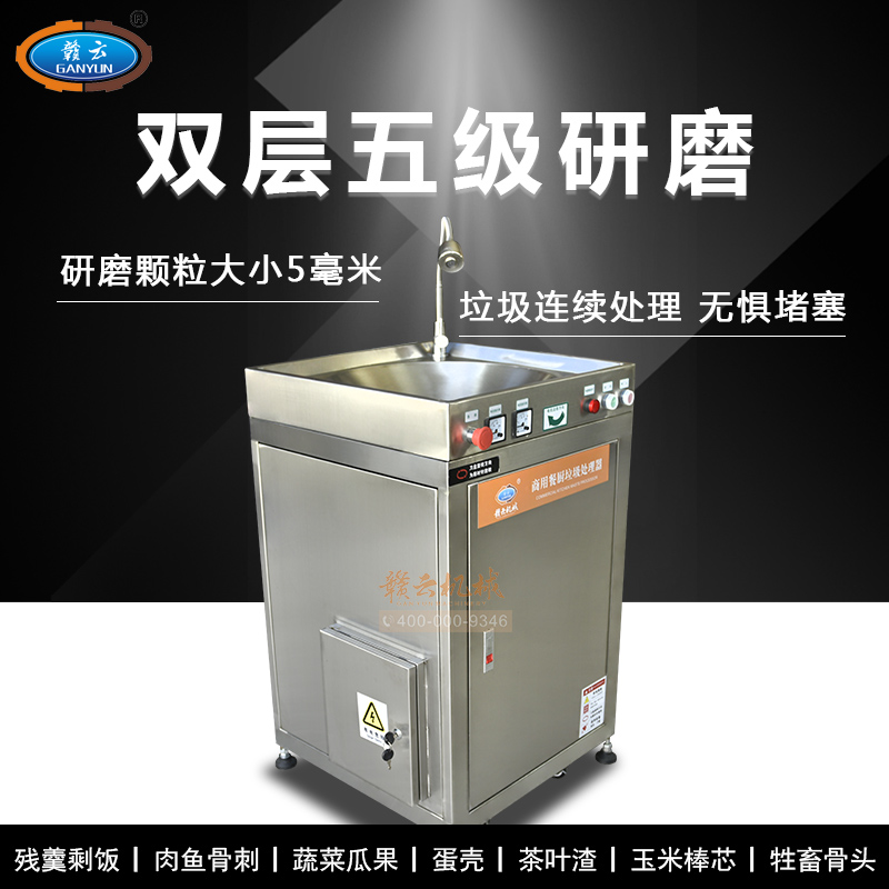 商用垃圾處理器,雙層五級研磨技術,研磨顆粒大小5毫米,食物垃圾連續處理,無懼堵塞可處理的垃圾:殘羹剩飯、肉魚骨刺、蔬菜瓜果、蛋殼、茶葉渣、玉米棒芯、牲畜骨頭、硬質貝克等食物垃圾