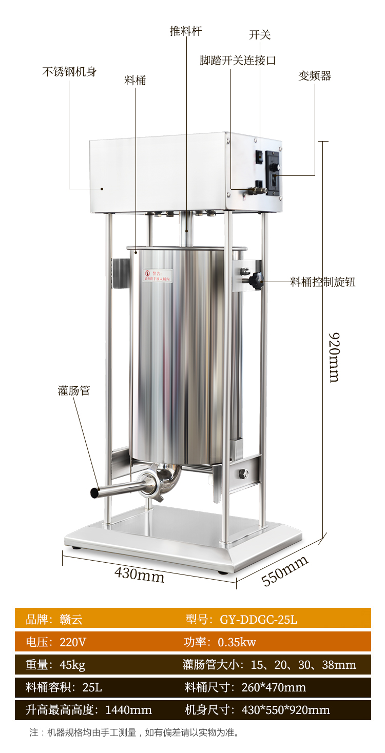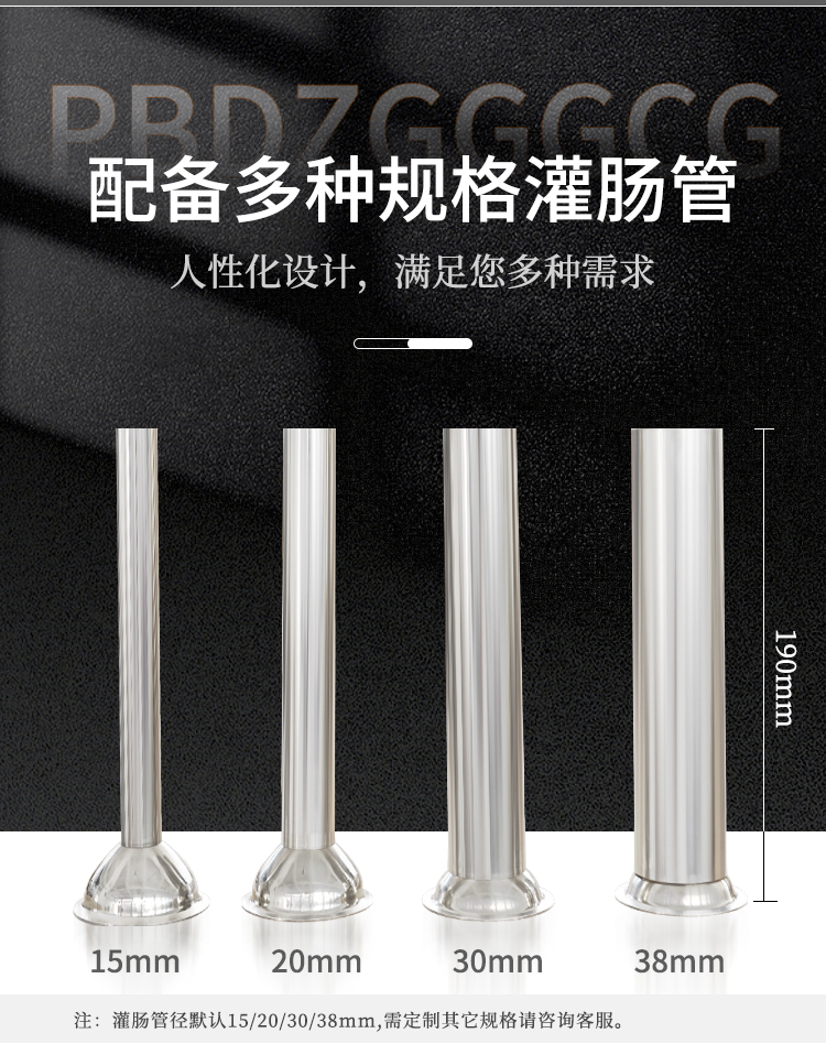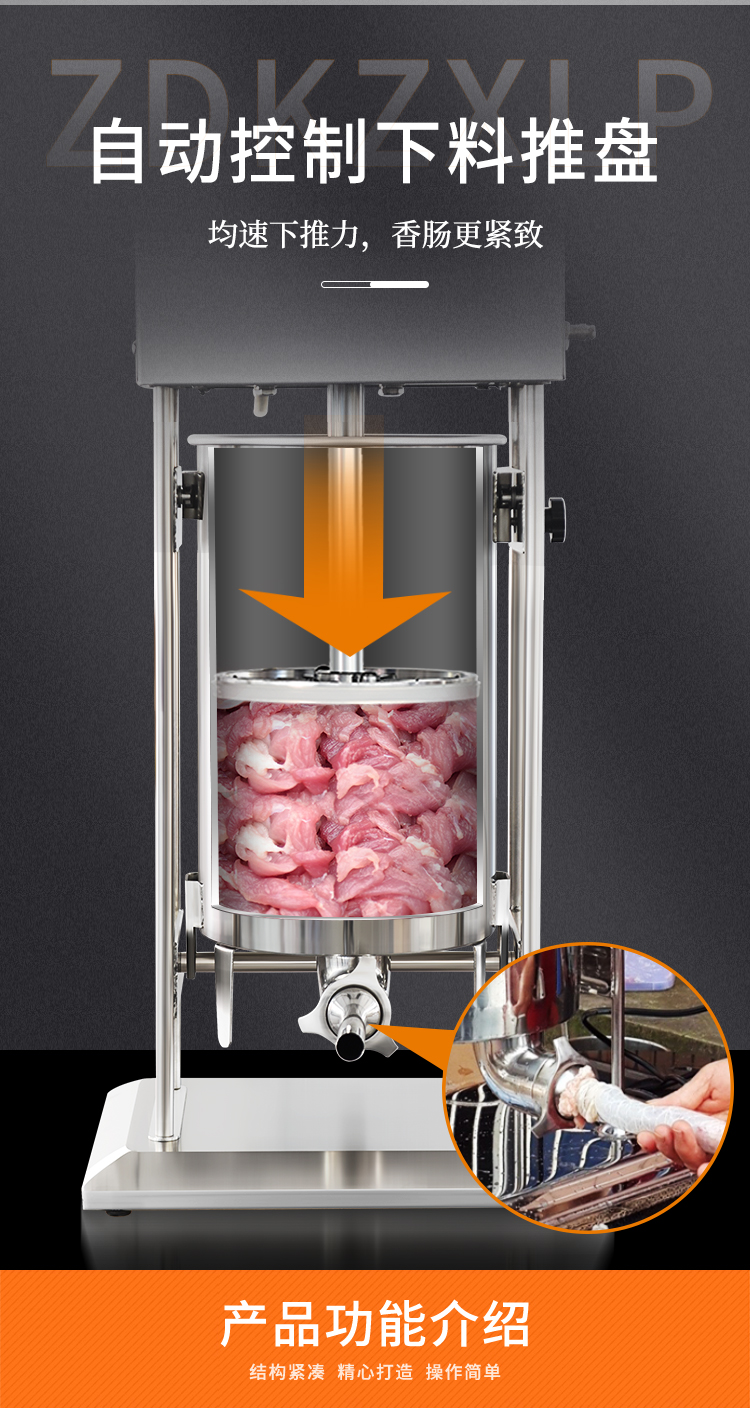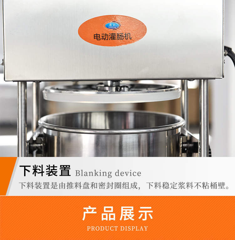 贛云機械電動灌腸機采用不銹鋼材質,灌腸機可以單人操作,實現輕松灌腸機,下料裝置是由推料盤和密封圈組成,通過電動驅動,均速下推力,讓下料穩定漿料不粘桶壁。機器適用物料范圍較廣,無論是四川香腸,湖南臘腸,脆皮腸,山東香腸,廣式臘腸,河南臘腸都可以輕松灌制