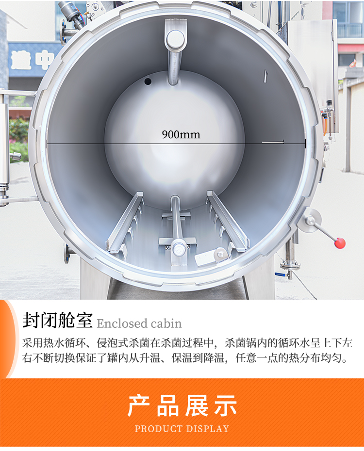 高溫殺菌鍋(殺菌釜)利用鍋內轉換的熱水循環,浸泡式高溫滅菌,在工作的過程當中高溫殺菌鍋心對鍋內的溫度壓力、殺菌時間、進汽、排汽、進水排水等過程,設備全部采用電腦自動化控制,使鍋內所有區域溫差在0.3度左右,確保生產出來的產品的色澤、口味、營養成分不會改變,適用于罐頭(如:肉類、魚類、蛋類、蔬菜類、粽子等罐頭) 及需要高溫用殺菌的蛋白飲料(如:馬口鐵罐、玻璃瓶罐頭、蒸煮袋等):特別適合罐頭類(如:火腿腸、蒸煮袋裝雞、扒雞、純牛奶等)