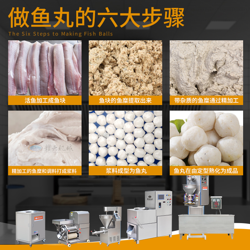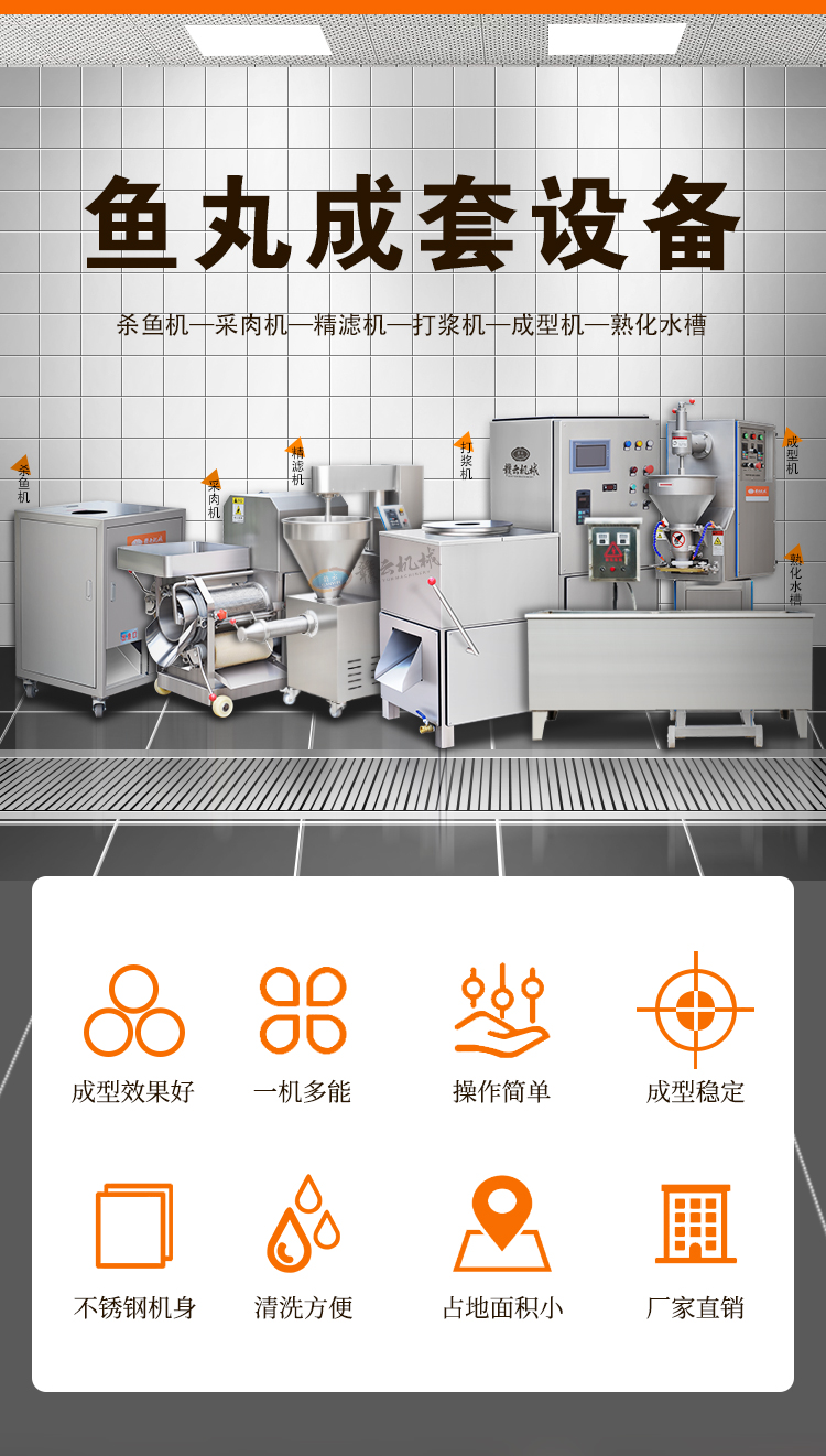 本套設備從殺魚、采肉、魚糜精濾、魚肉打漿、魚丸成型到最后的熟化。