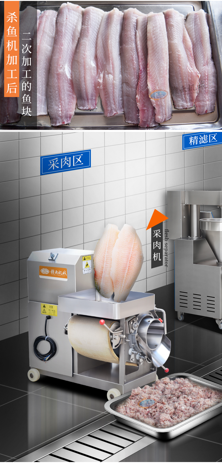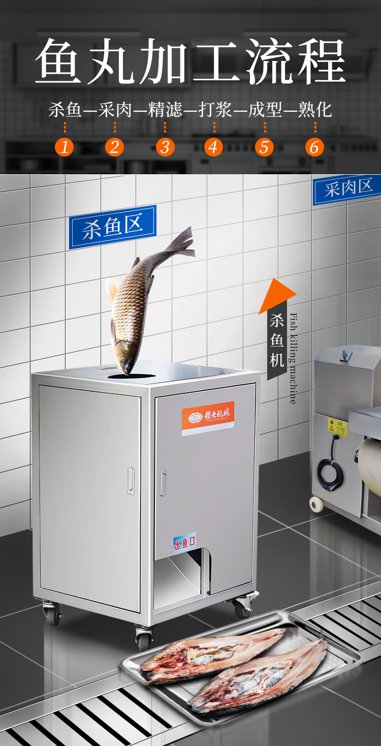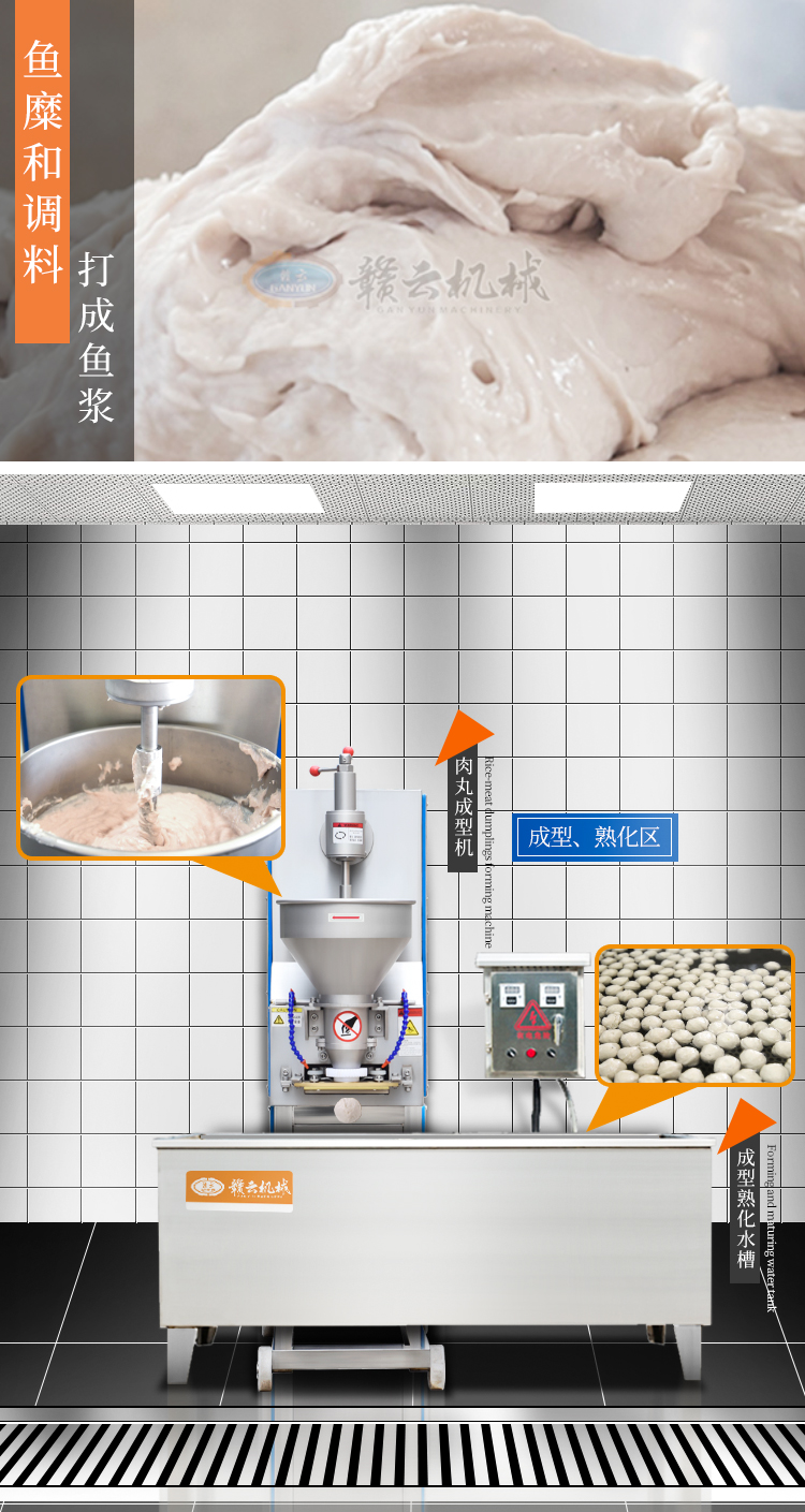 本套魚丸設備包含:殺魚機、魚肉采肉機、魚肉精濾機、三速制冷打漿機、搖擺肉丸機、雙溫控加熱水槽。操作步驟是先將活魚通過殺魚機,先開肚去魚鱗,然后將殺好的魚通過分切后,進入魚肉采肉機進行魚肉魚刺分離。若需要提升魚丸的品質,建議將采集好的魚肉, 通過魚糜精濾機將魚肉中的魚筋、魚血、魚皮等在次進行過濾出來,經過這一步驟得到的魚肉品質就很高。將已經精濾過的魚肉通過三速制冷打漿機進行打漿和配料。最后將打好的魚漿通過搖擺肉丸機進行成型和定型熟化。