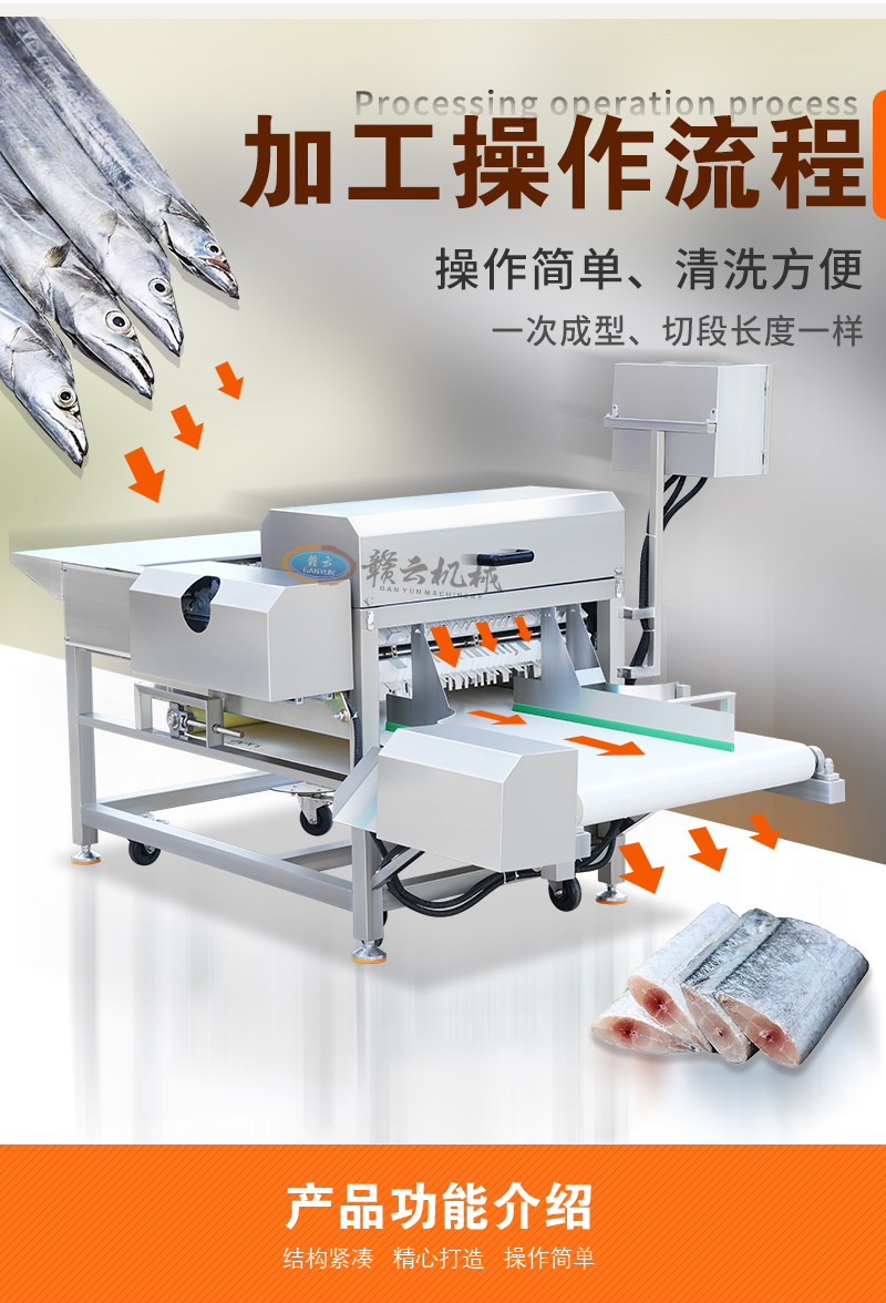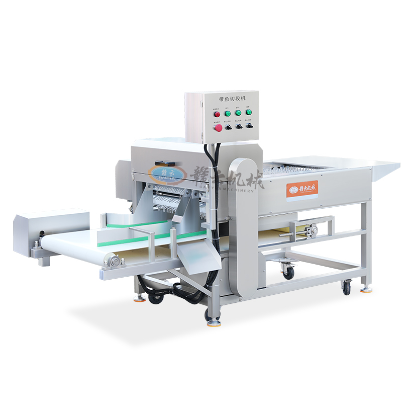 全自動帶魚切段機采用食品級不銹鋼制造,通過輸送式傳送帶魚,經過高速旋轉的圓形刀能快速高效精準地切割帶魚,設備結構緊湊堅固耐用,適用于鮮、微凍帶魚、秋刀魚、鴨脖、長條果蔬、山藥、鮮肉等多種長條物料切割,一機多用,切割效果好,切面平整,整體操作簡單,支持定制切割尺寸,滿足不同加工需求,是一款專業帶魚切段機設備。