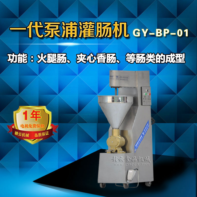 泵浦式灌腸機:可自動灌制各種香腸。火腿腸及臺式熱狗腸等等,產量能達到300kg/小時,操作方便。配有大、中、小管?烧{換。設備配置電動、連動及腳踏控制系統,配套電機可調速生產。