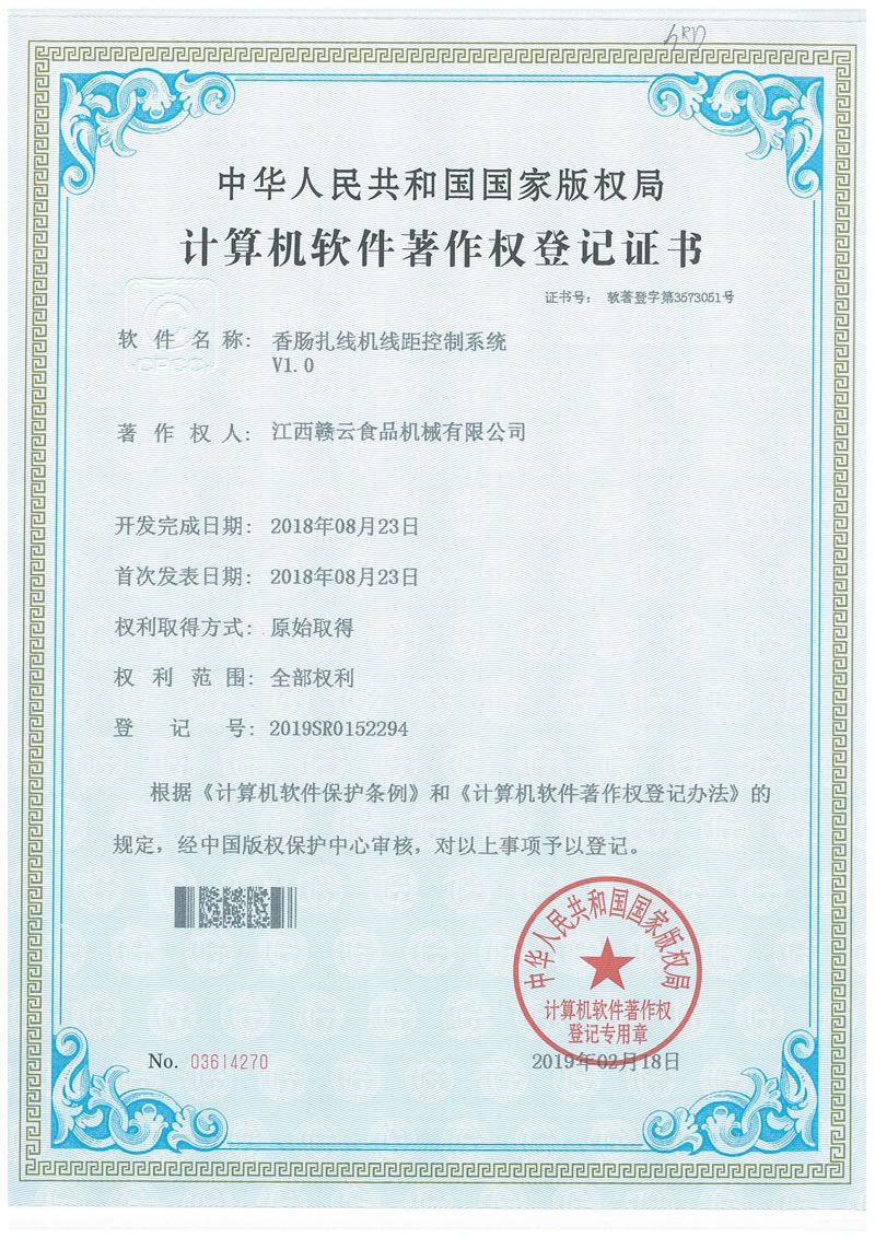 計算機軟件著作權登記證書(自動香腸打結機扎線控制程序系統)