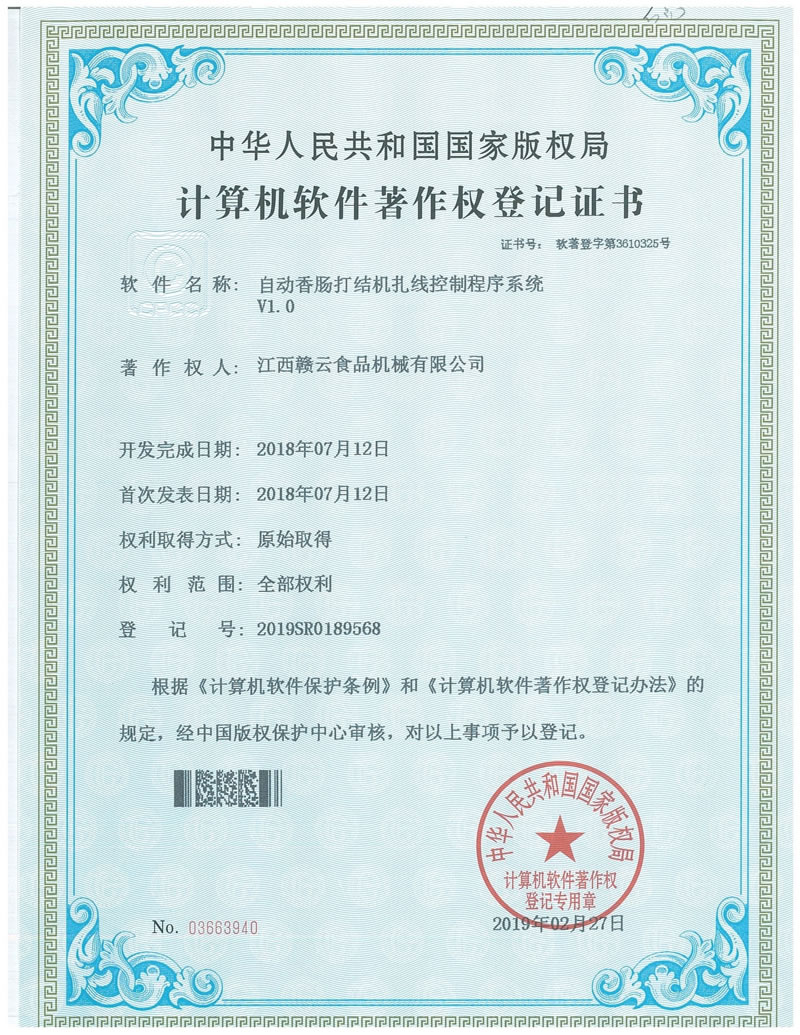 計算機軟件著作權登記證書(自動香腸打結機扎線控制程序系統)