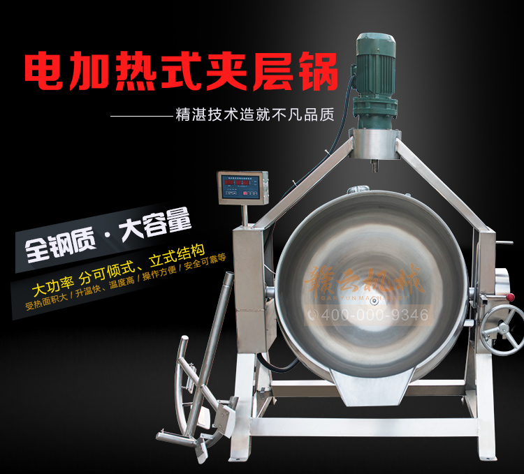 電加熱夾層鍋采用全鋼材質,304不銹鋼鍋,安全衛生,雙加熱按鈕控制,定時溫控帶攪拌功能。200L大容量