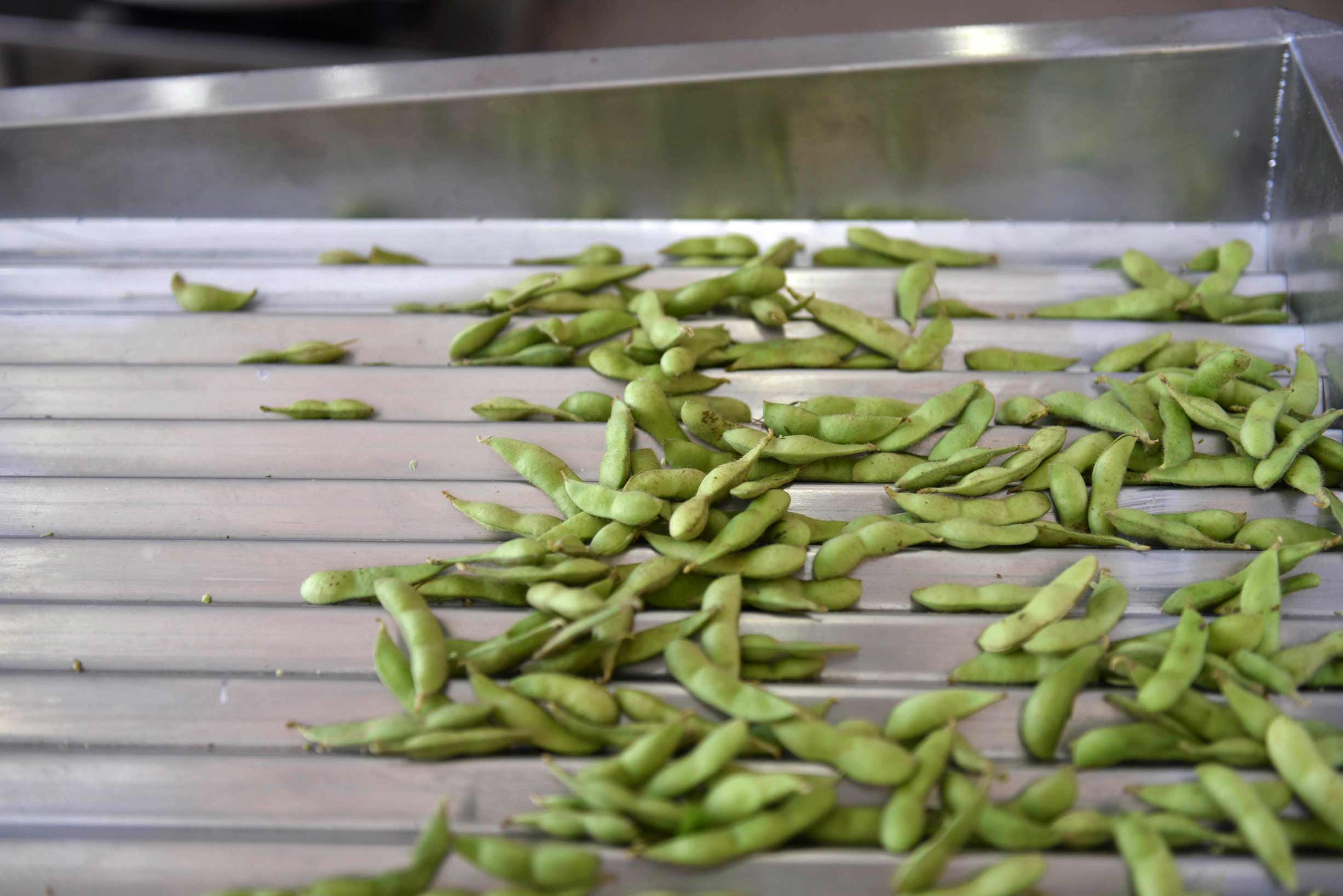 另一款是毛豆脫皮機,這款機器的特點是剝出來的毛豆帶衣,顆粒飽滿。以下是試機效果