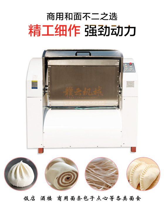 贛云100KG和面郎,超強模擬手工和面,使面的勁道快速形成,蛋白組織結構均衡,最終面的筋性、咬勁、拉力都遠遠優于其他形式和面機的和面效果,并且加工出來的面食,口感光滑、彈性好、咬勁十足.