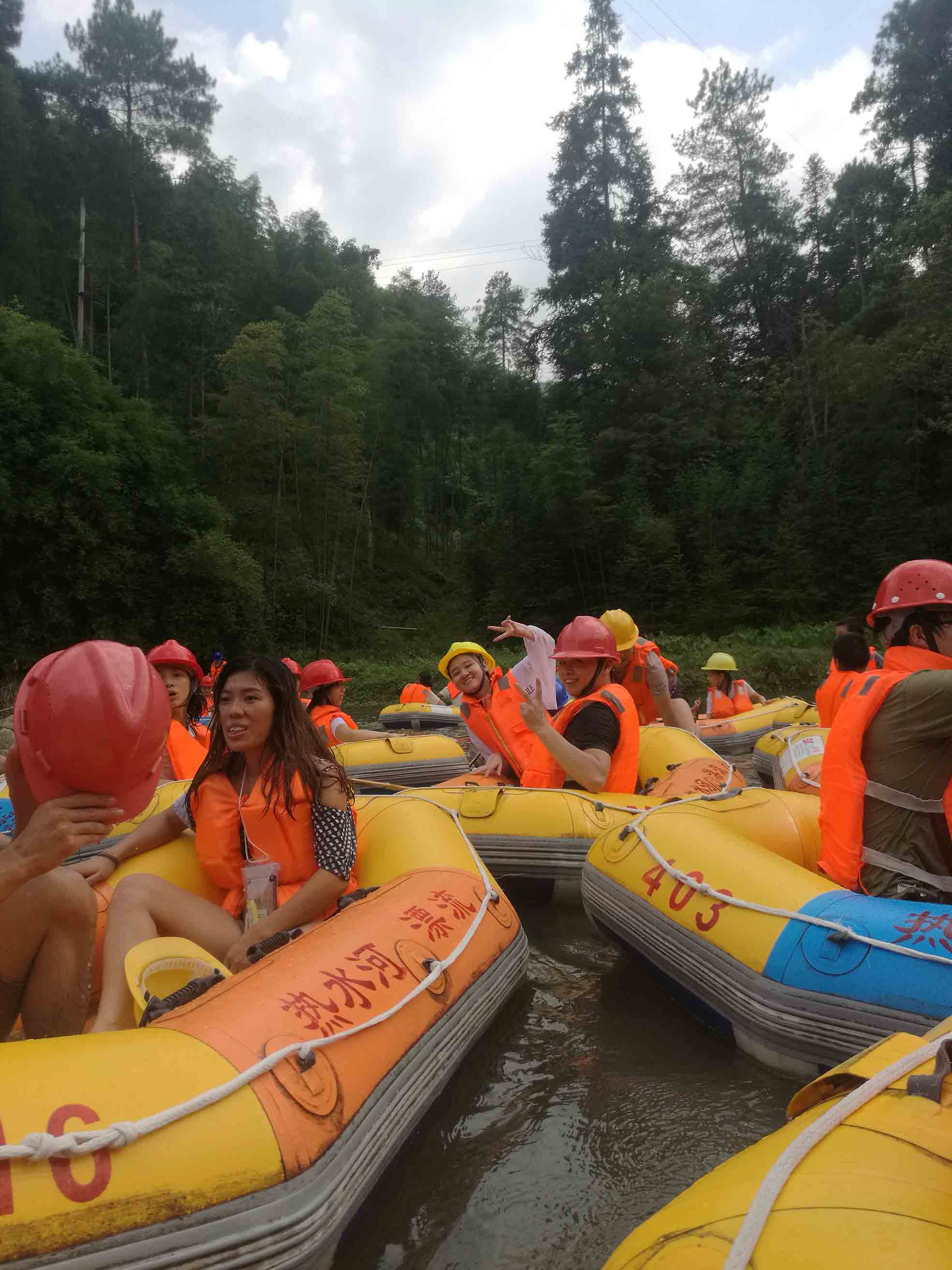 中午,大家集合聚餐。在農(nóng)家的院子里,體驗鄉(xiāng)村的生活,大家互相交流情感。吃了農(nóng)家菜之后,便開始走上了漂流之旅,此次漂流的地點是在湖南汝城熱水河漂流,兩岸青山依依,竹海呢喃,自然形成的青石河,小橋、古樹、田野、村莊,無限風(fēng)光。大家駕駛著雙人座特制橡皮艇,穿峽谷、越險灘,時兒急流激蕩,時兒緩流輕越,迎面而來的是一種其樂無窮的驚、險、奇。在比較平緩的水灘上大家在享受優(yōu)美自然景色,打水仗等,同時,也不忘留影紀念,這次旅游不但營造了和諧融洽的集體氣氛,而且增進了彼此的情感。